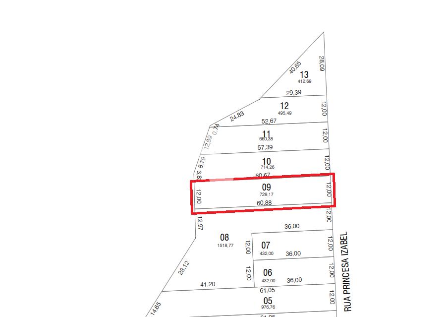 São 729m², com 12 metros de frente, na Rua Princesa Isabel.